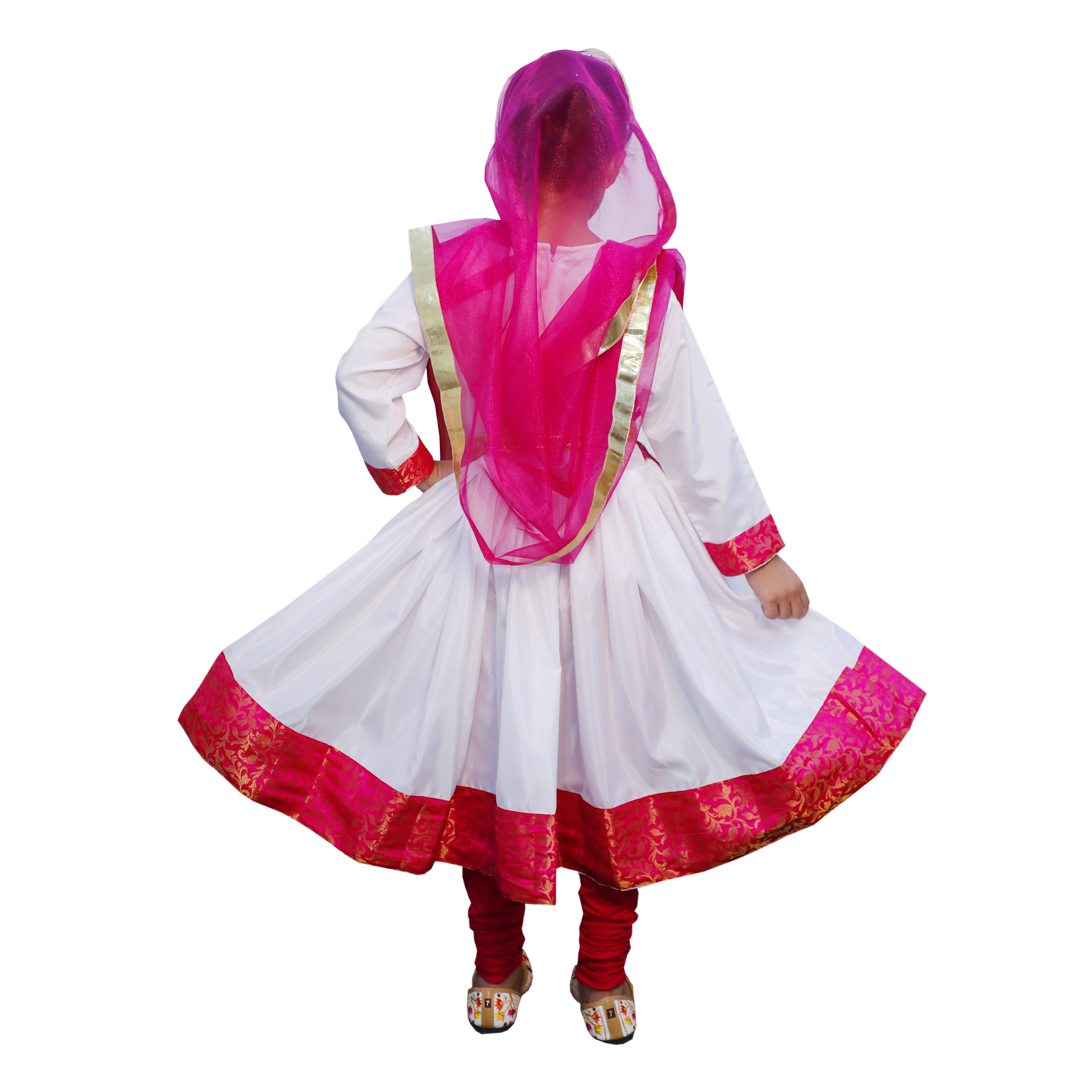 A beautiful Kathak white outfit for kids in your home. So let them wear our premium quality fabric product. Costume of Kathak is ideal for dance academies and school events. The jewelry shown in the picture is not included with this Kathak dress. Also, check our top-of-the-line best-selling dance costumes like Bharatnatyam Dress.